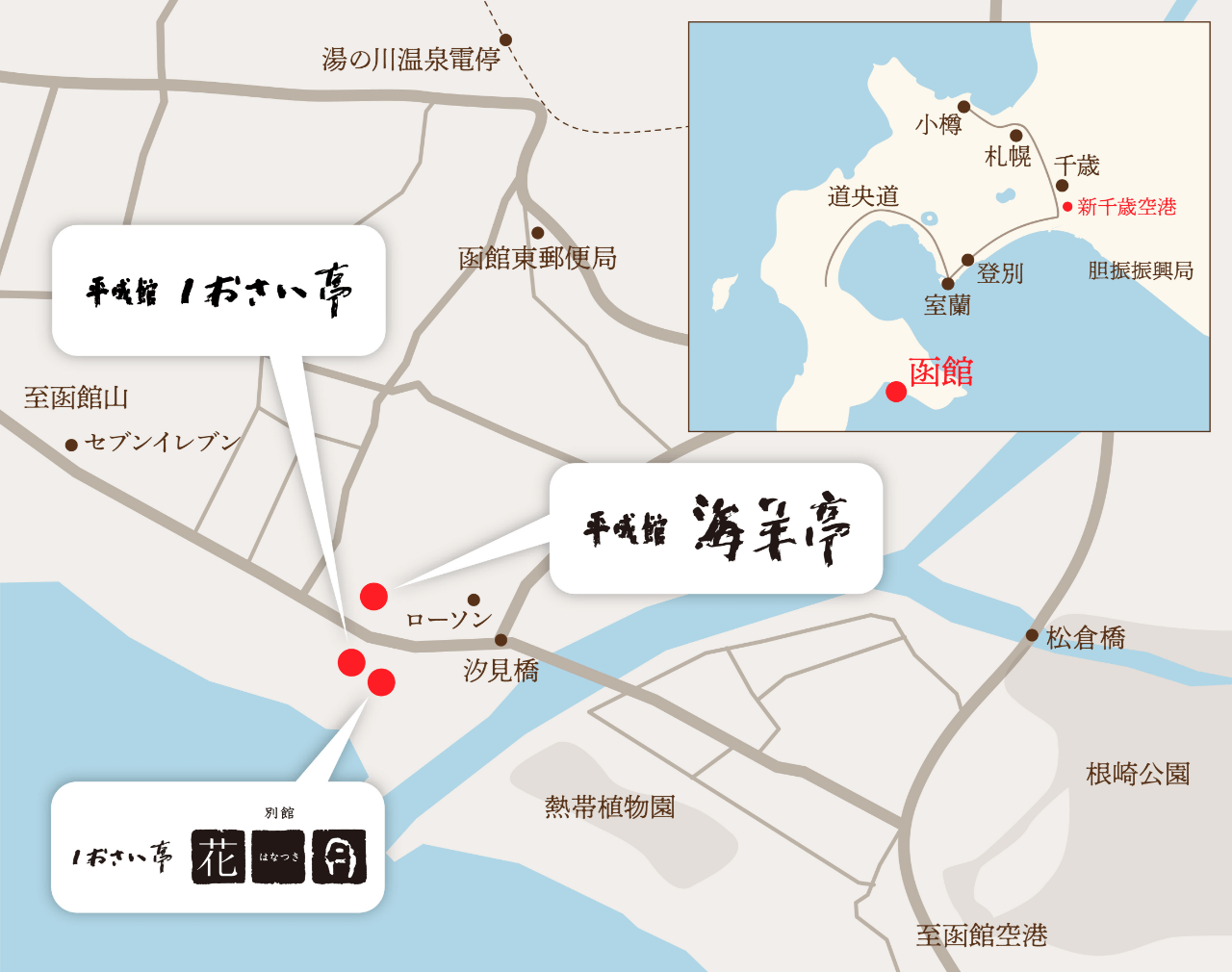 | 小樽から | 小樽 → 函館 湯の川温泉 約5時間(高速道路利用) |