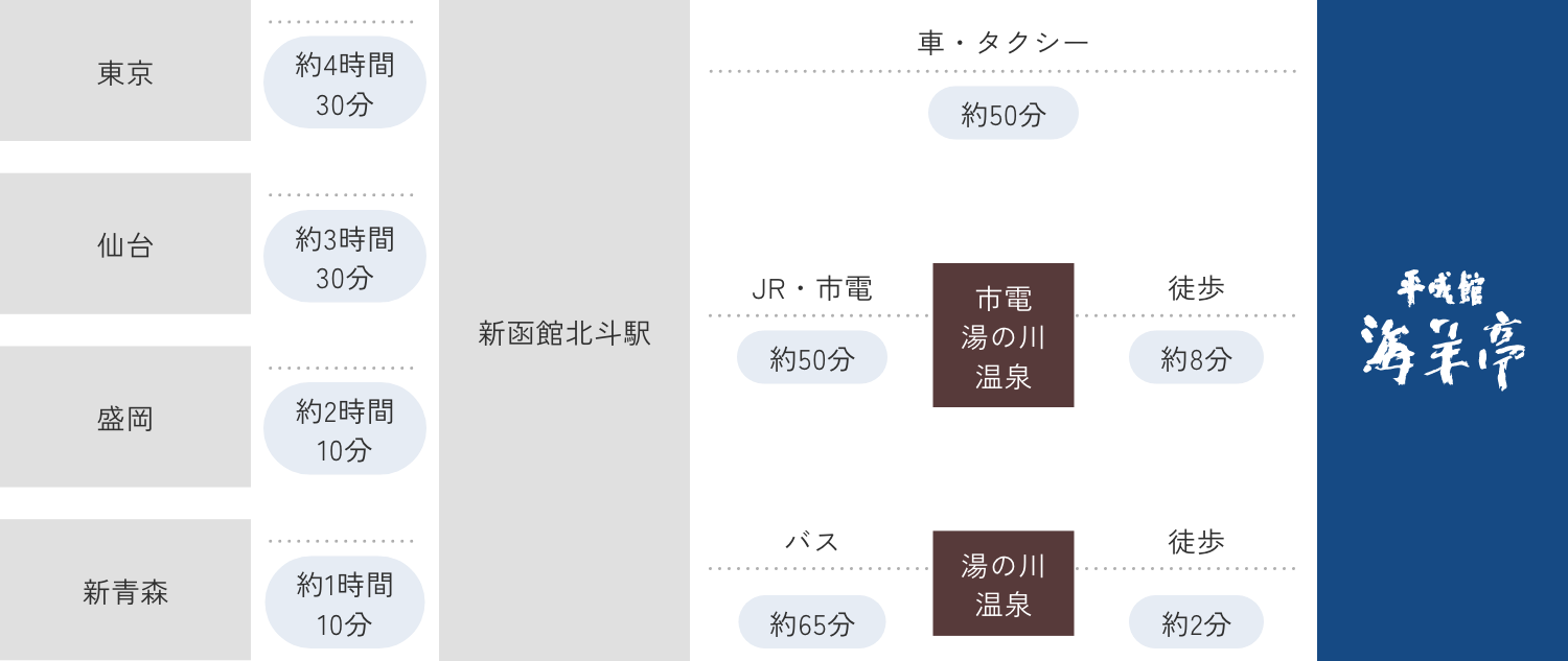 | 從苫小牧 | 苫小牧 → 函館湯之川溫泉 約 4 小時(使用高速道路) |